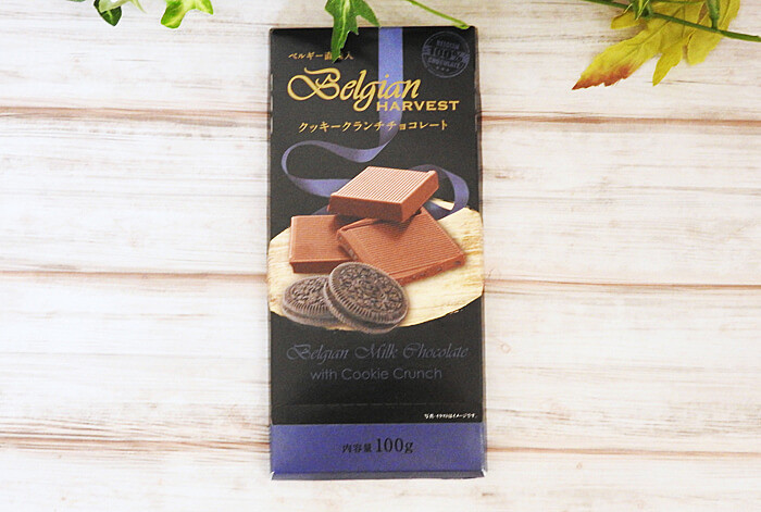 高級感のあるパッケージデザインが印象的な業務スーパー「クッキークランチチョコレート」178円(税別)。ベルギーから輸入している板チョコです。板チョコは100gとやや小さめサイズ。業務スーパーとしてはコスパはイマイチですね。