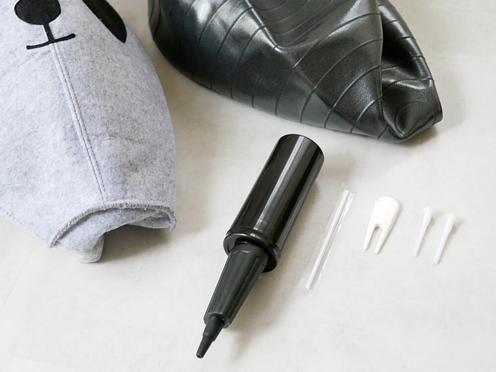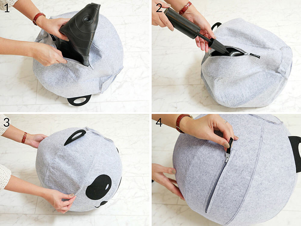 ボールカバーにインナーボールをセットする際は、空気注入口がファスナーの中心に来るようにセットしてください。そうすることで、空気が入りやすく、栓もしやすくなります。