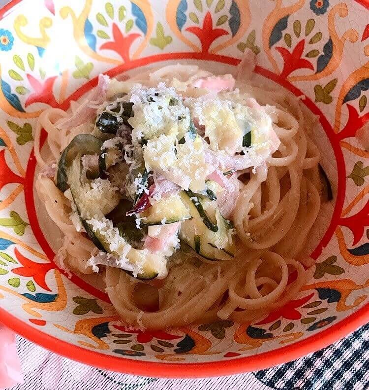 実際に友人が作ってくれたパスタです。カルボナーラで食材はベーコン、玉ねぎ、ズッキーニとシンプルなものだったのですが、家庭のパスタとは何かが違う。