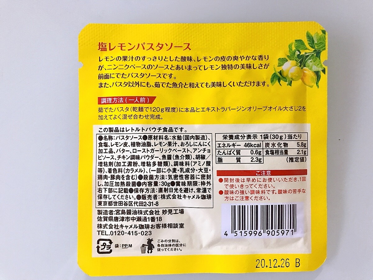 パウチの後ろの成分を見てみると、アンチョビが入っていました! 個人的には、オイルサーディンの缶詰で作るレモンパスタよりもこちらの方が複雑な味がして、何よりレモンの風味が強くていいなと思いました。税込124円でこの美味しさと手軽さは申し分なしです。
