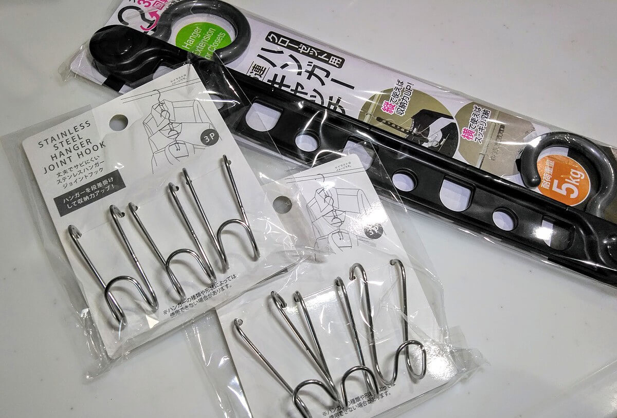 セリア「クローゼット用ハンガーキャッチ5連」と「ジョイントフック」活用