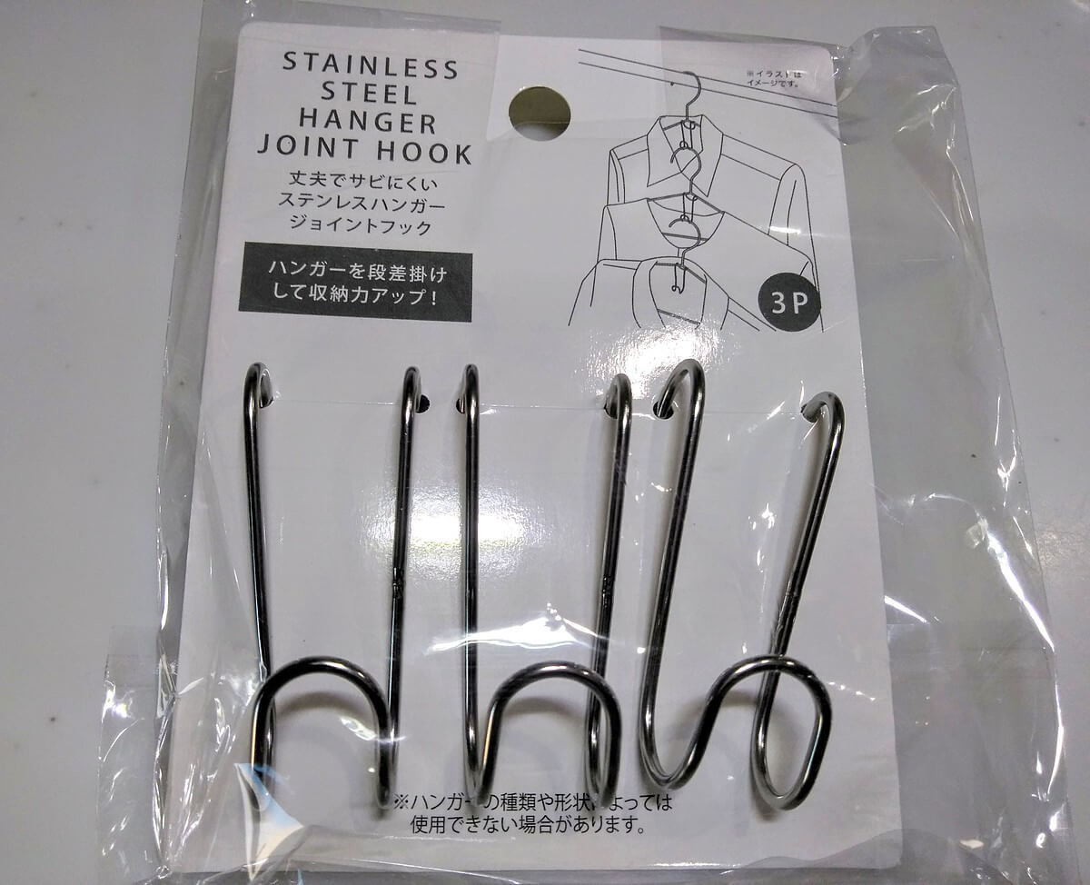 ステンレスハンガージョイントフックは3個入りです。 ハンガーの首の部分にこのフックをかけておくことで、他のハンガーと縦に連結して収納ができるというものです。