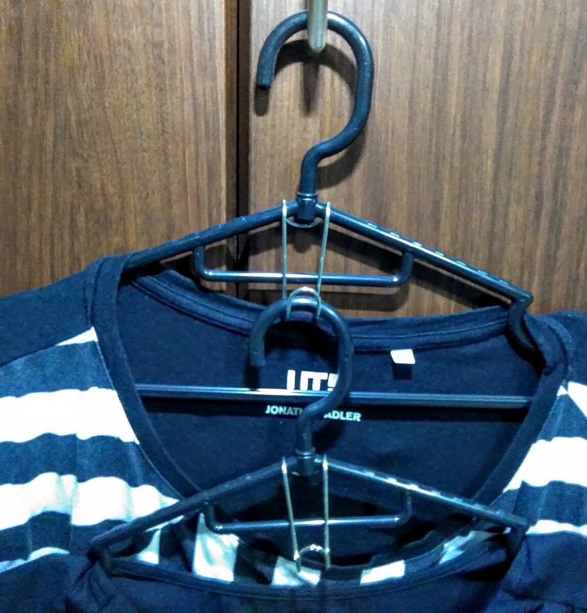 先ほどのハンガーキャッチと条件をそろえるため、2セット使って6個のハンガーを連結してかけてみます。