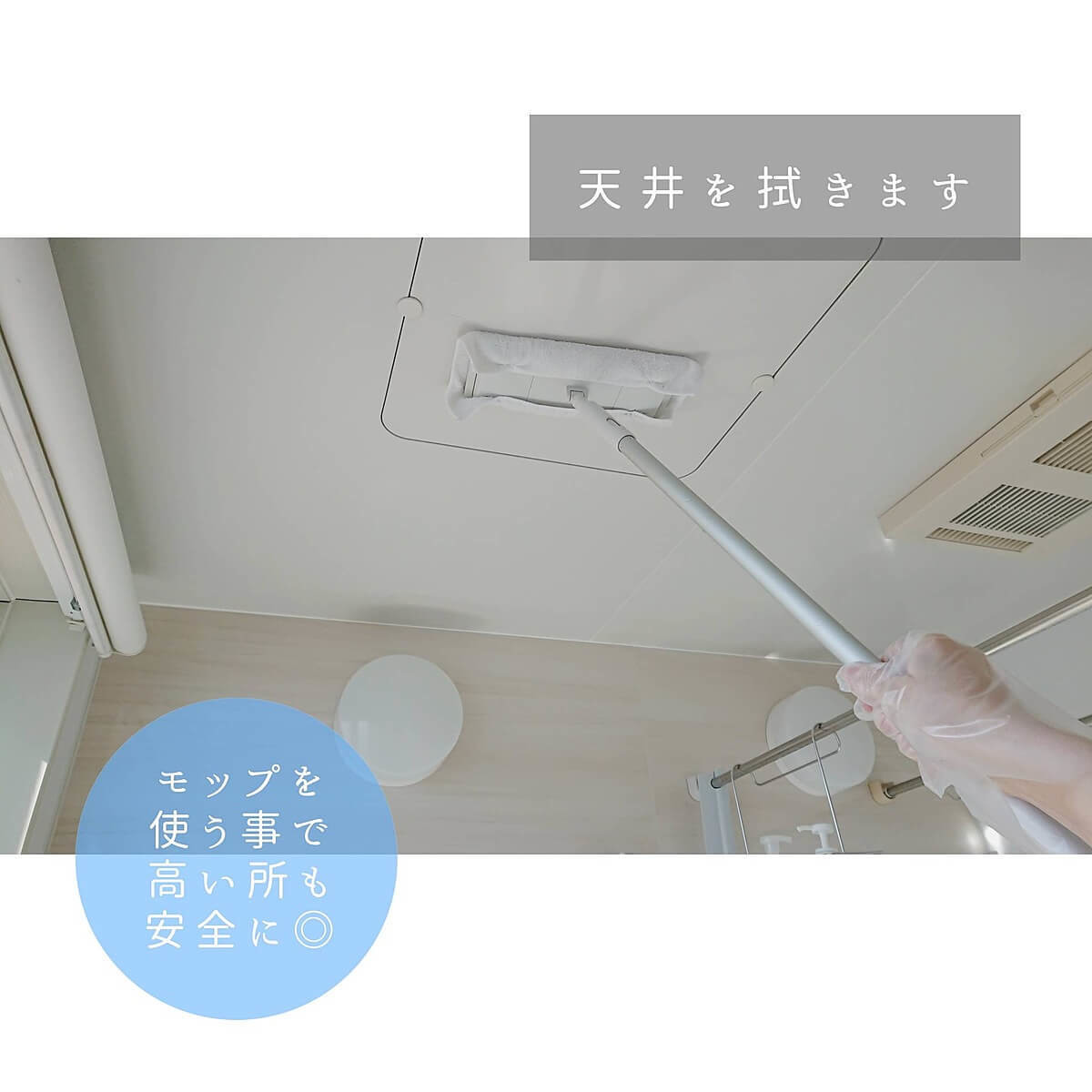 お風呂の天井掃除には、モップがあると便利。 モップのペーパーをつける部分に、雑巾や薄手の布巾などをセットして、拭きあげましょう。