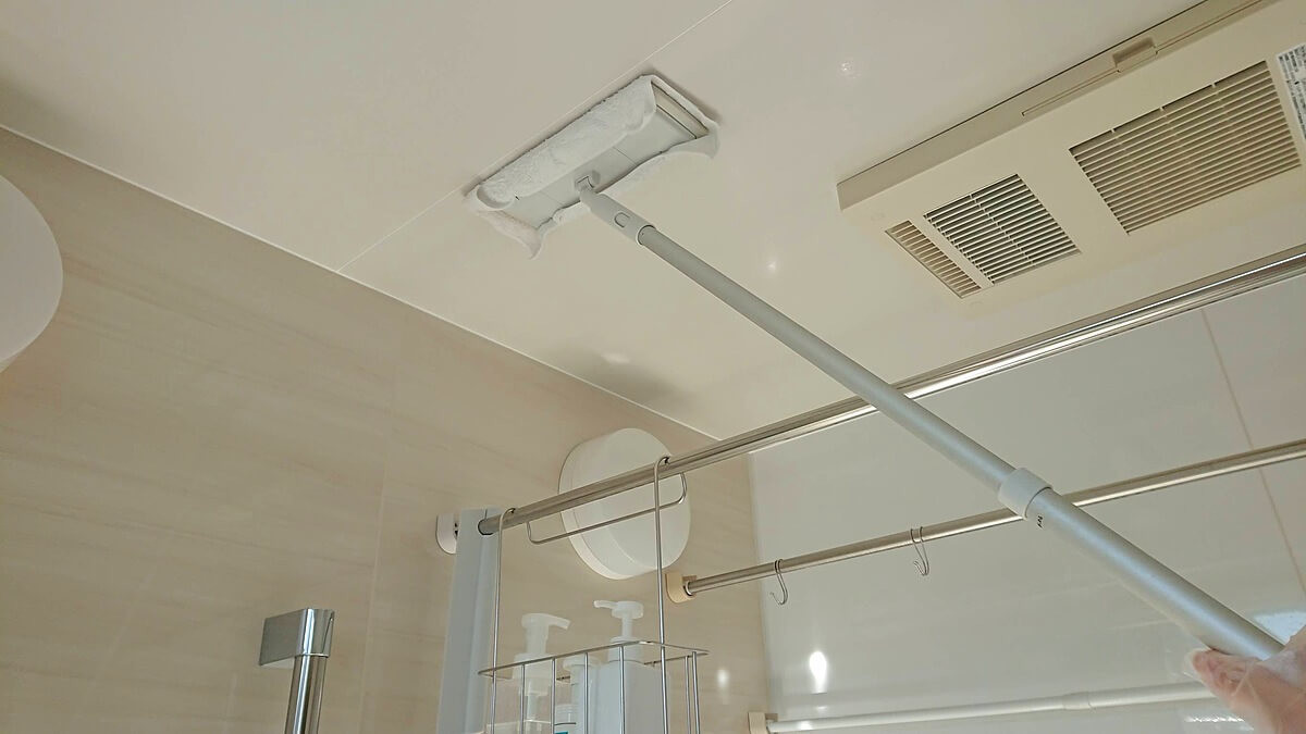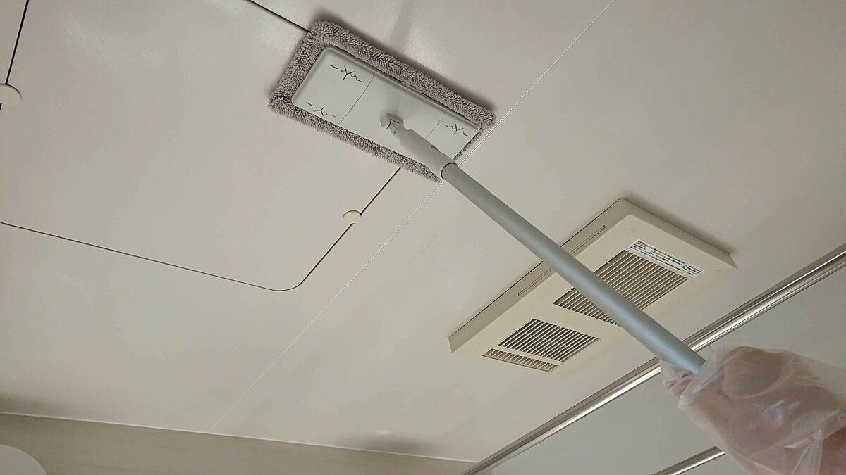 (1)にぞうきんを浸してよく絞り、モップにつけて浴室の天井を拭きます。