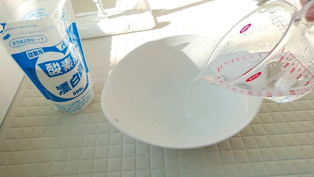 カビがひどい場合、(1)で作った酸素系漂白剤を溶かしたお湯につけ置きします。