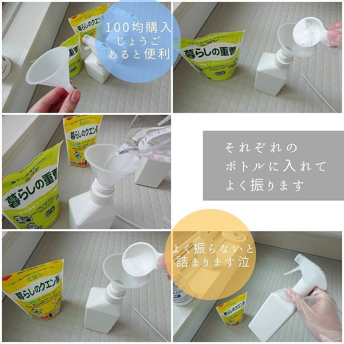 スプレーボトルに水を入れ、クエン酸を入れてよく溶かします。クエン酸は水によく溶けるので、入れすぎないように注意しましょう。