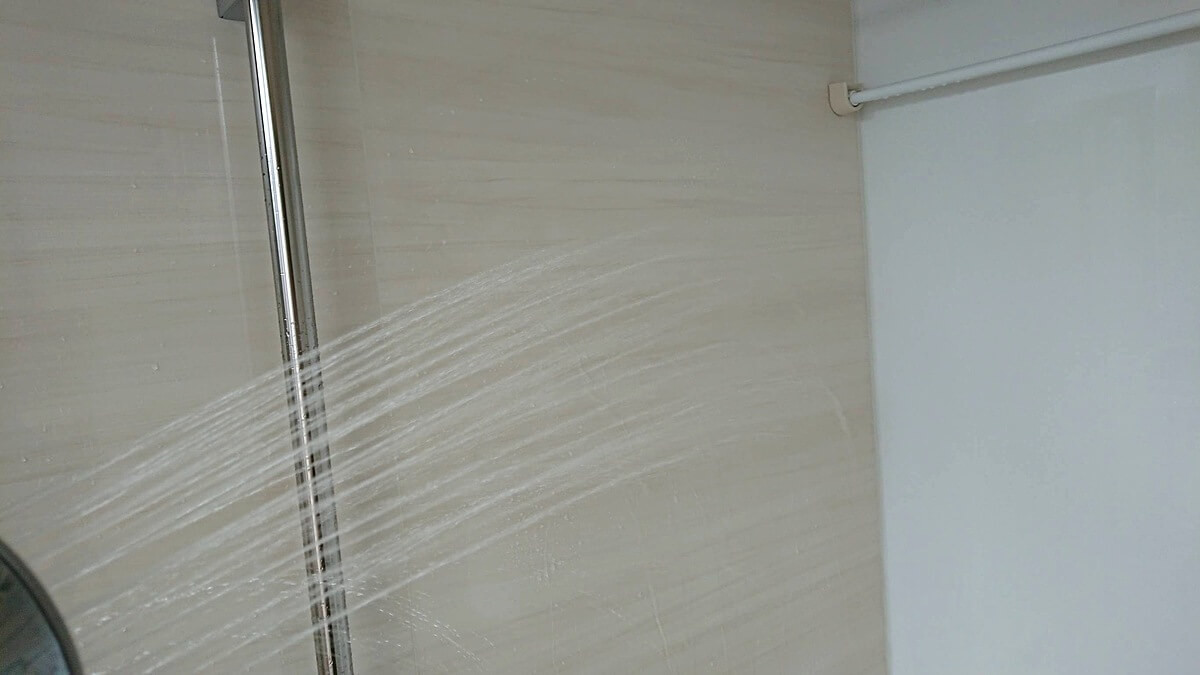 そのため水で洗い流したら、一気にスクイージーをかけるか、乾いたぞうきんで拭きあげます。