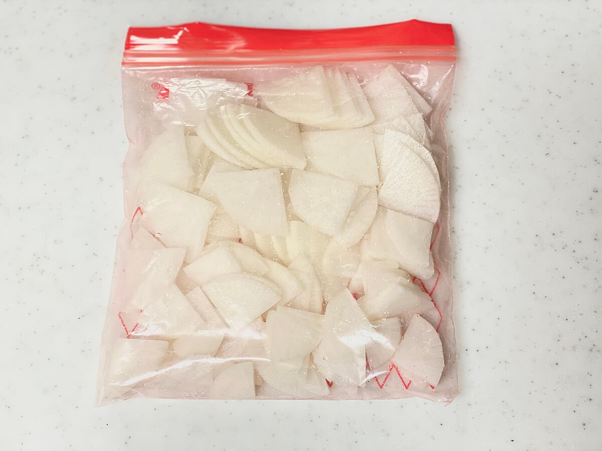 いちょう切りにした大根は保存袋に入れて冷凍し、使う時は冷凍のまま調理します。食べ応えもあり、火も通りやすく時短調理ができる切り方なので、使い勝手がいいのです。