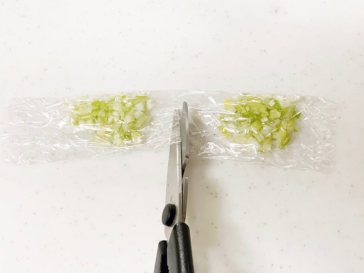 包んだら、真ん中をハサミで切ると、無駄なく保存できます。