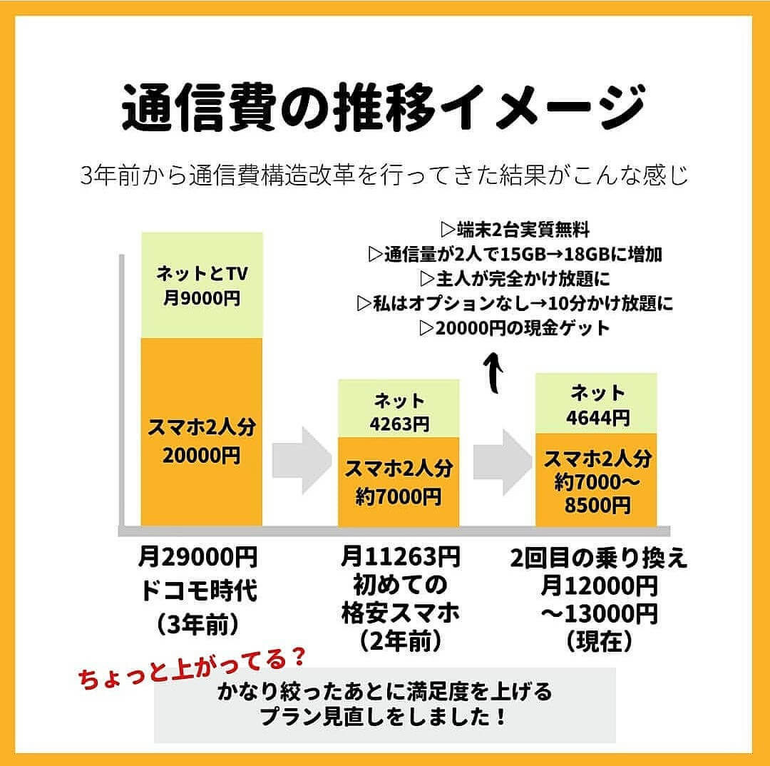 スマホ代、TVの視聴料、インターネット契約などの通信費と向き合った結果、2年前に比べて約19万円の年間固定費を削減することに成功しました。