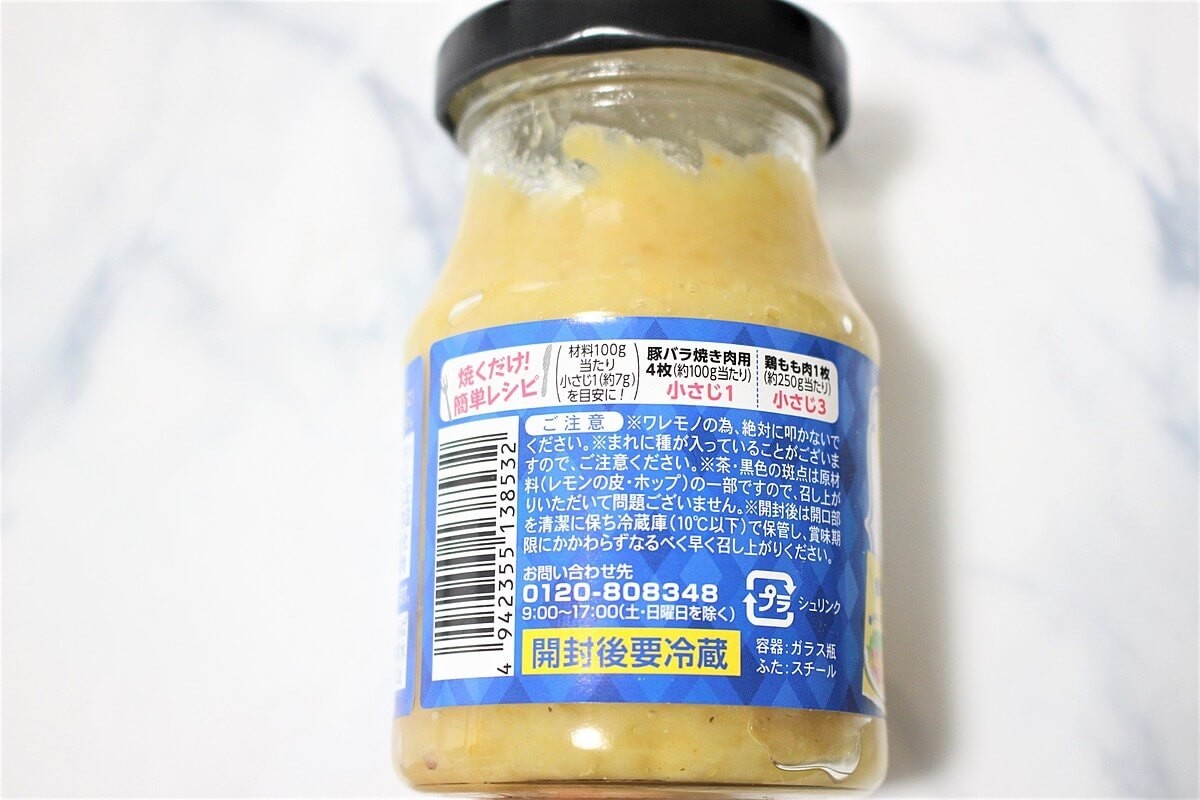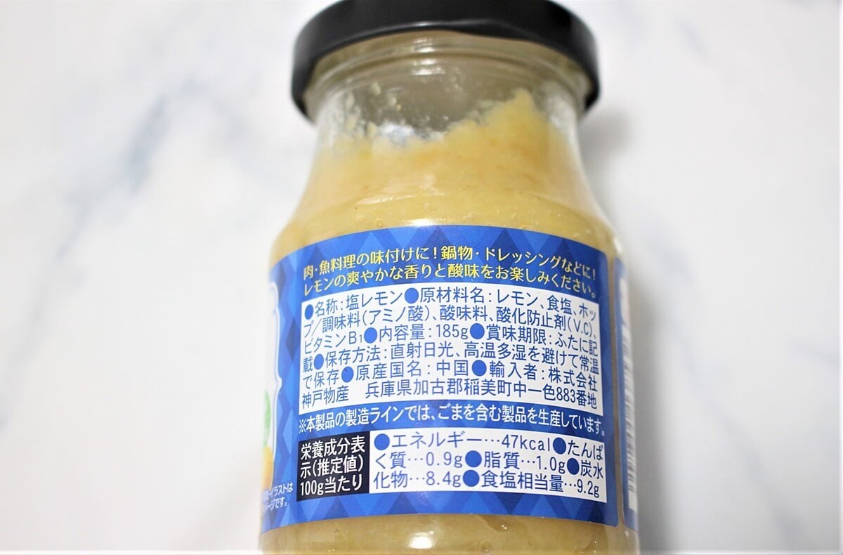 他のものが業務用で大きい中、塩レモンは直径約6センチ、高さ約10センチと小ぶりのビンで、上段にひっそりと置かれてました。