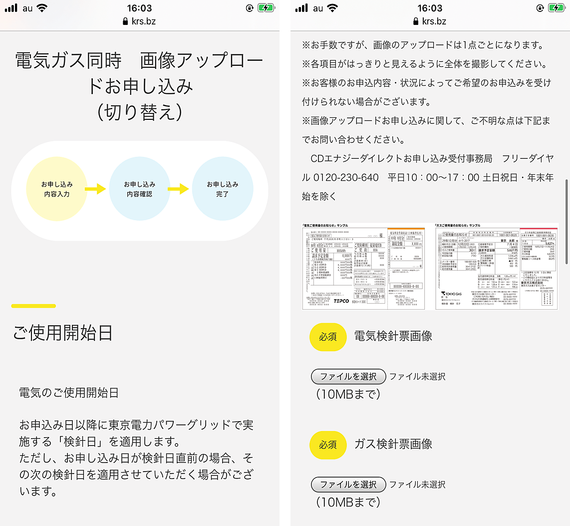 自宅に届く検針票を用意して、スマホで撮影。その画像をホームページ上にアップロードするだけで、あとはCDエナジーのほうで手続きをしてもらえます。