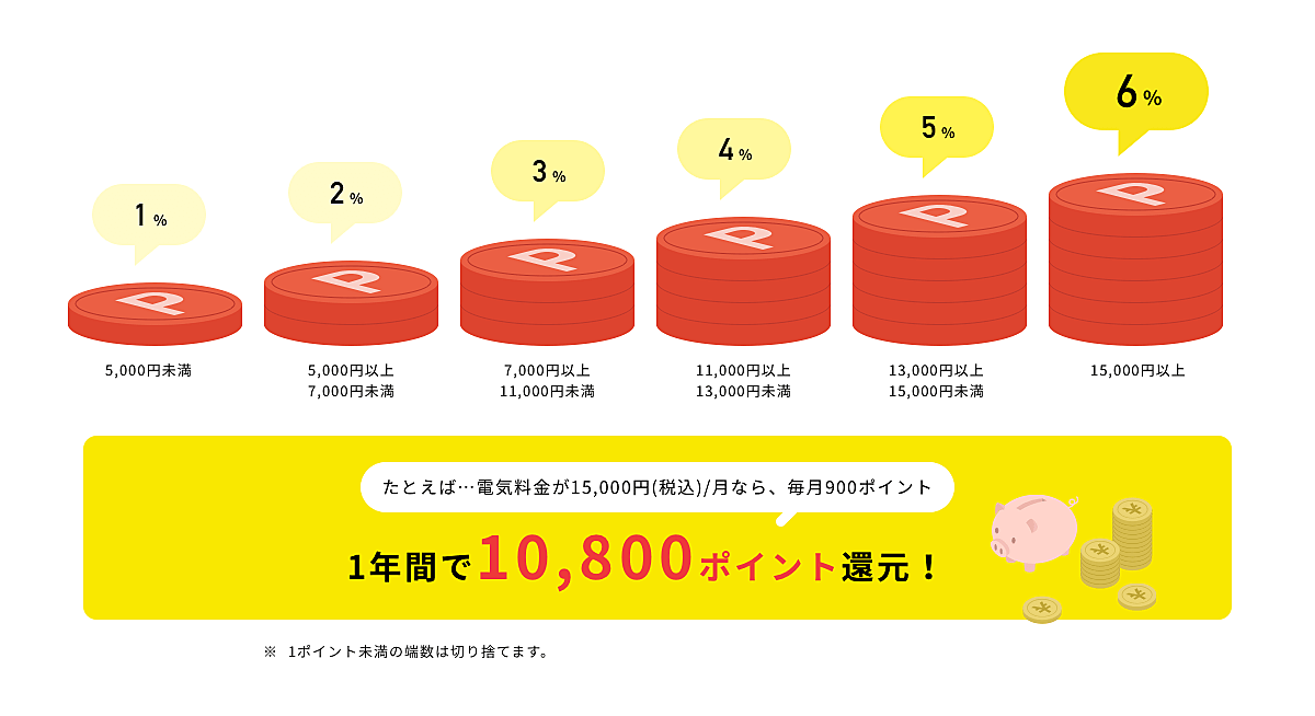 たとえば、電気料金が15,000円(税抜)/月なら、毎月900ポイントがたまる計算。1年の還元額は、10,800ポイントです。