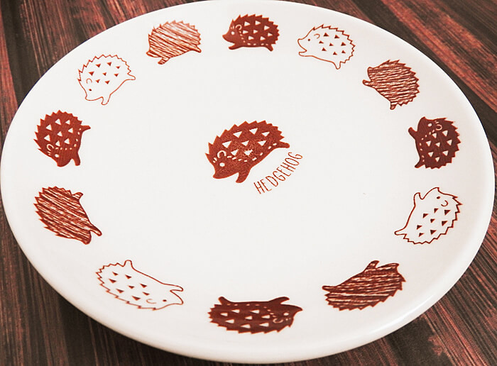 上で紹介したプレートよりも一回り大きいダイソーのハリネズミシリーズ「プレート(約12cm)」。ハリネズミはお皿中央部分に一匹&お皿の周りがハリネズミが走っているようなデザイン。結構芸が細かいですね。お値段は100円(税別)です。