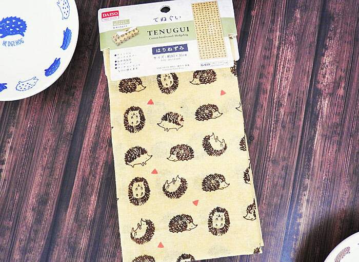 ハリネズミシリーズの食器だけでも良いですが、同じくダイソーで販売しているハリネズミの「てぬぐい」をランチョンマットとして使用するとおそろい感が出ていいかもしれません。