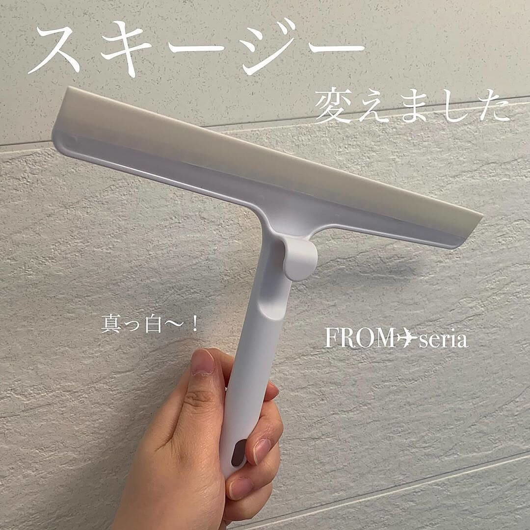 手軽に水気をきれるセリアのスキージー(水切りワイパー)は全体が白で見た目もおしゃれ。ひっかける部分が2か所あるので、片づけがしやすくなっています。
