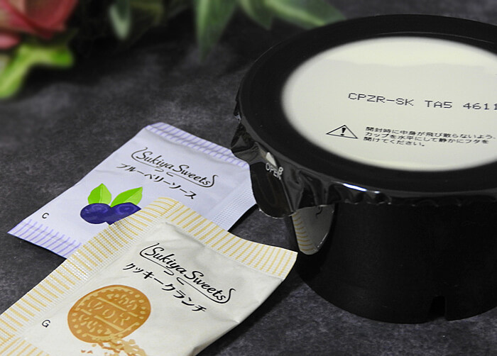 クッキークランチとブルーベリーソースは別添えになっています。まずはレアチーズをそのまま食べて、味に変化をつけたくなったらトッピングしてみても良いですね。自分のタイミングで味わいの変化をつけられますよ。