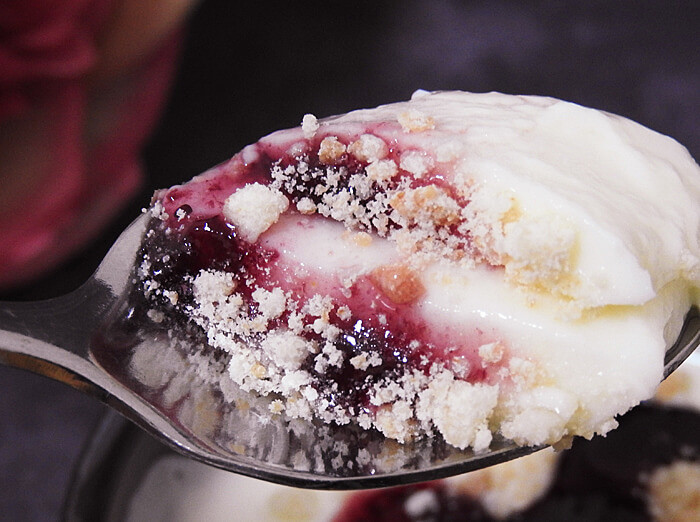 レアチーズの部分はわりとあっさりめ。レモン風味もあまりせず、クセがないので食べやすいのが印象的でした。しかし、レアチーズだけを食べ進めていくと物足りません。ざくざくとしたクッキークランチとブルーベリーソースをかけるとぐっと味わい深くなりました……!