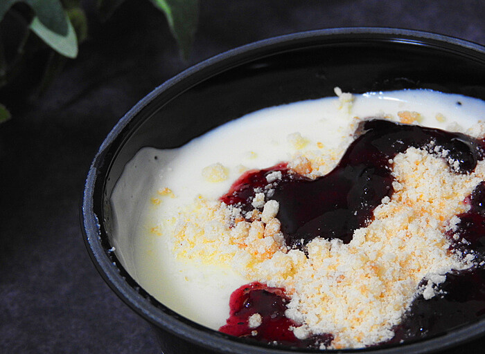 ▲牛丼チェーン店「すき家」のデザートには見えません。クッキークランチとブルーベリーソースをトッピングすると、高級感が出てきます。