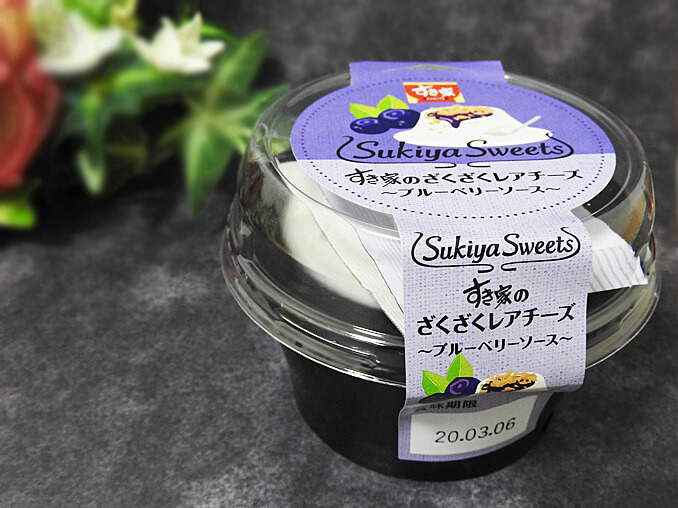 2019年12月11日(水)から販売開始されたすき家「ざくざくレアチーズ」220円(税込)。レアチーズの部分にはシチリア産レモン果汁を使用し、爽やかに仕上がった1品。お好みでクッキークランチとブルーベリーソースをトッピングしていただきます。