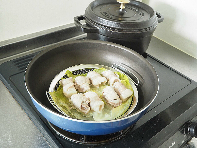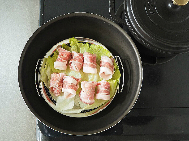 水を張ったフライパンの上に蒸しかごをセットし、レタスを敷いてから長芋を巻いた豚バラを並べます。