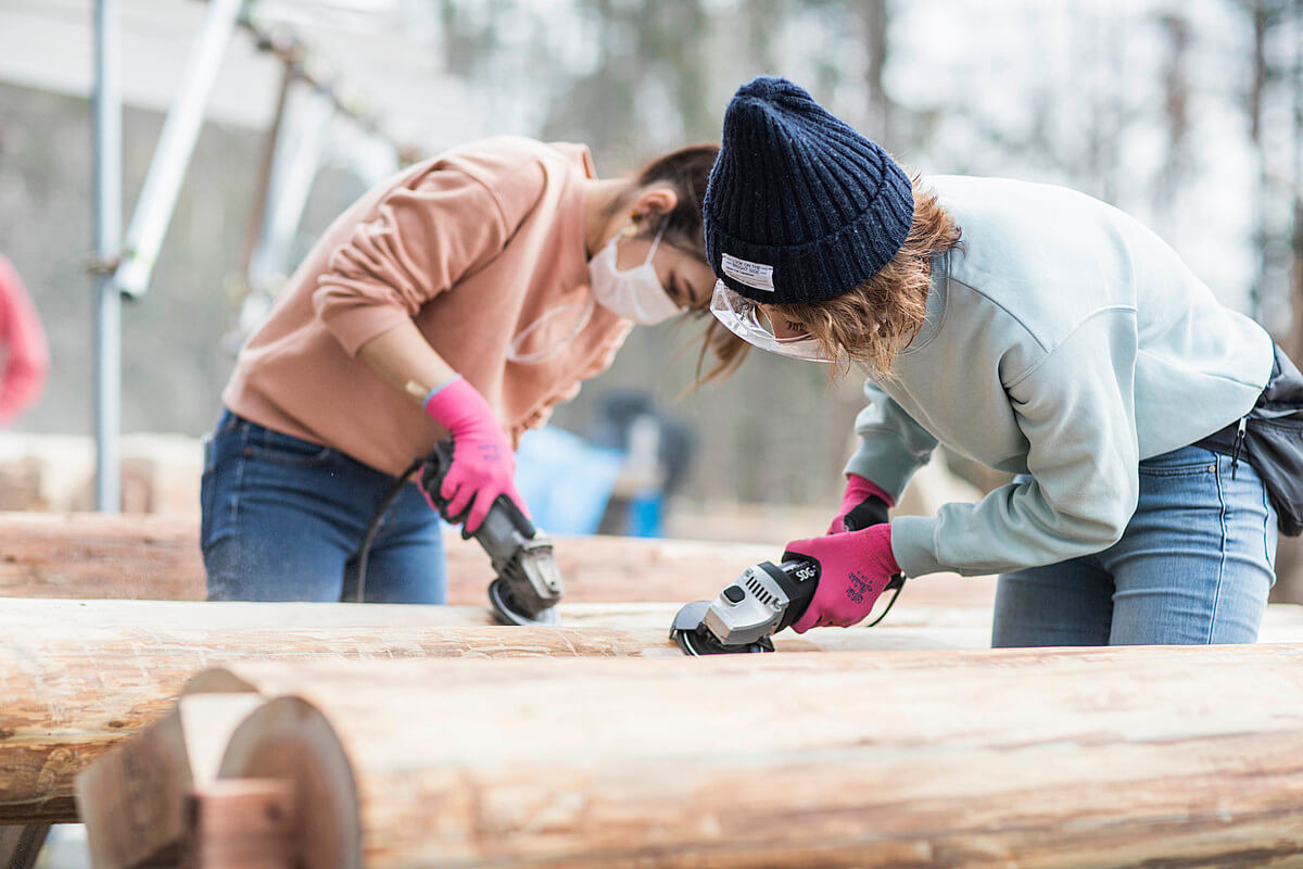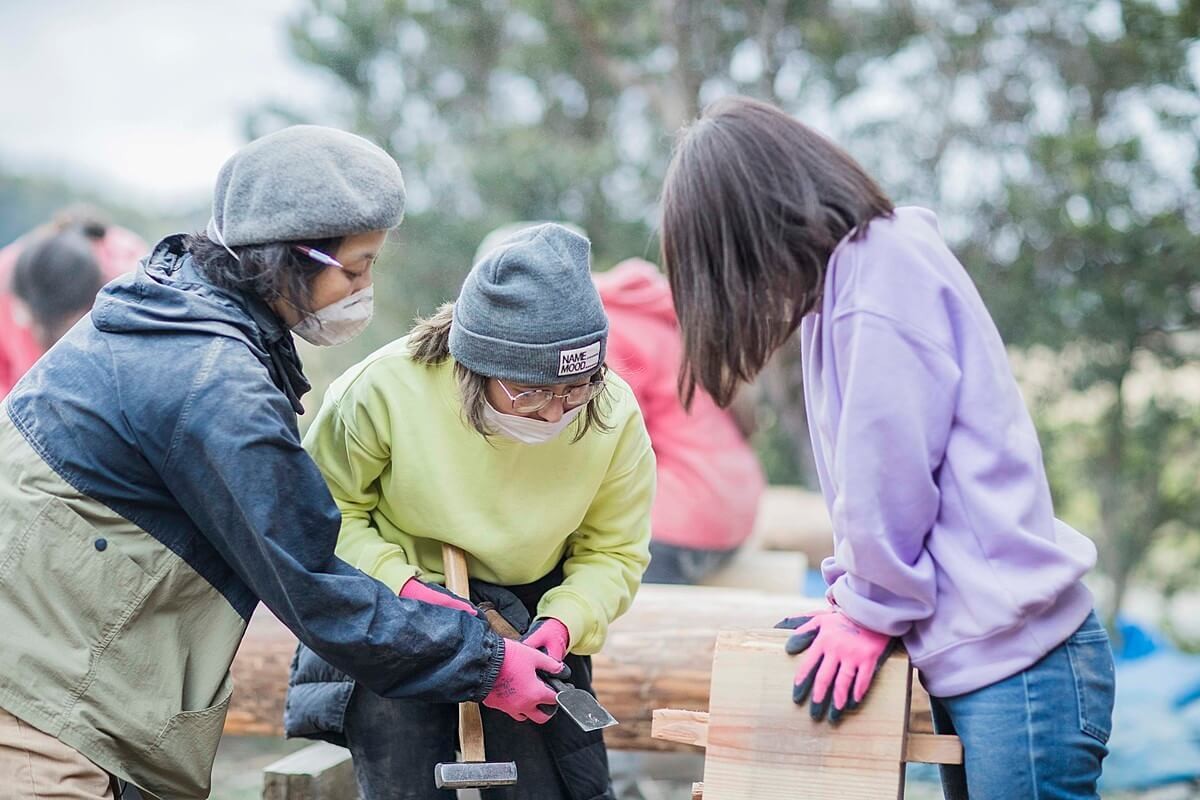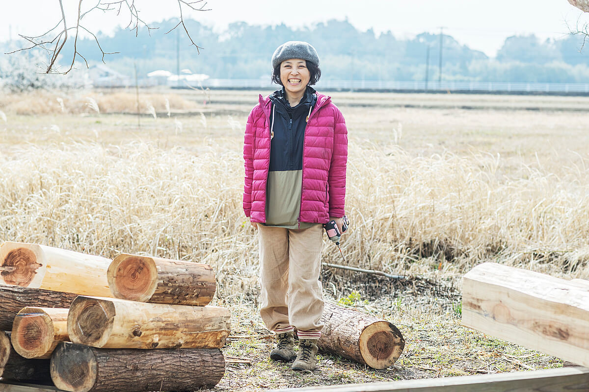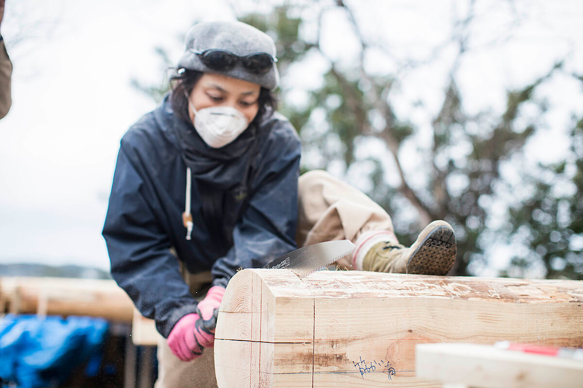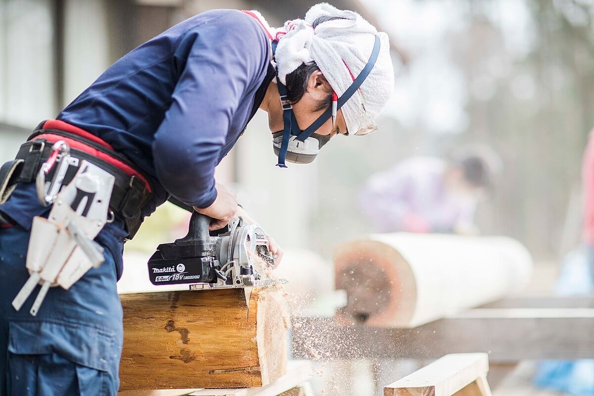 大きな工具を持って作業するのは、特に女性なら最初は誰でも不安です。でも、女性でも大工はできる!を証明したい。私も今でこそ難なく工具を使いこなせますが、約2年前は初心者で、チェーンソーなど工具の使い方を一から学びました。
