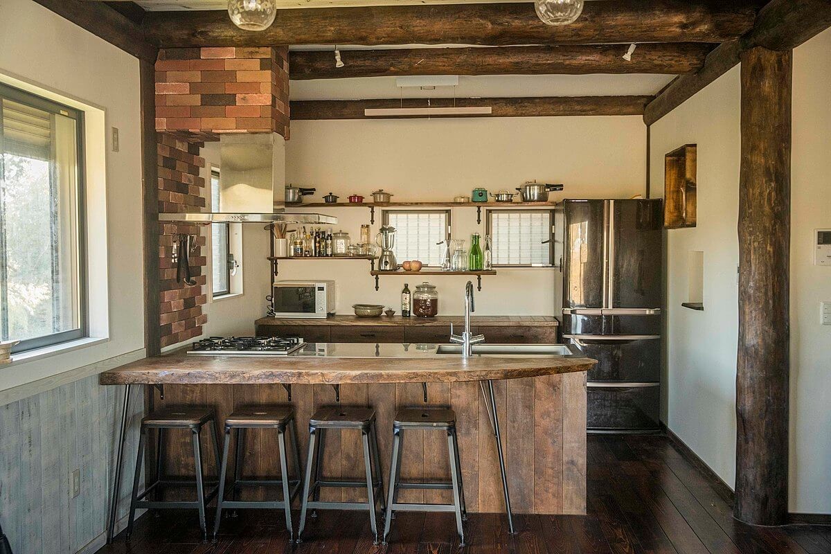 一枚板のカウンターが印象的なキッチン。自分で伐採から手がけるからこその、究極の贅沢です。