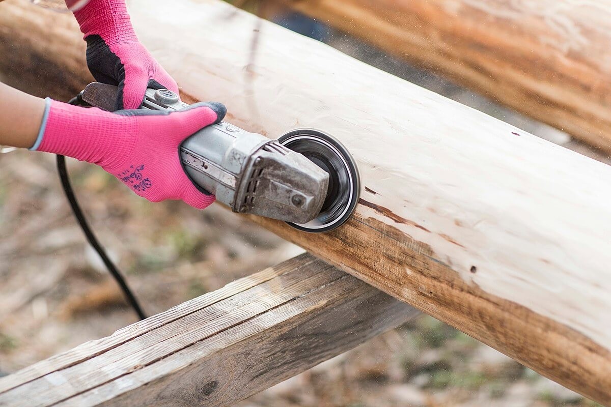 伐採したままの木は、表面がガサガサ。まずは木の皮をむいて、表面がなめらかになるように「グラインダー」という工具で磨きます。