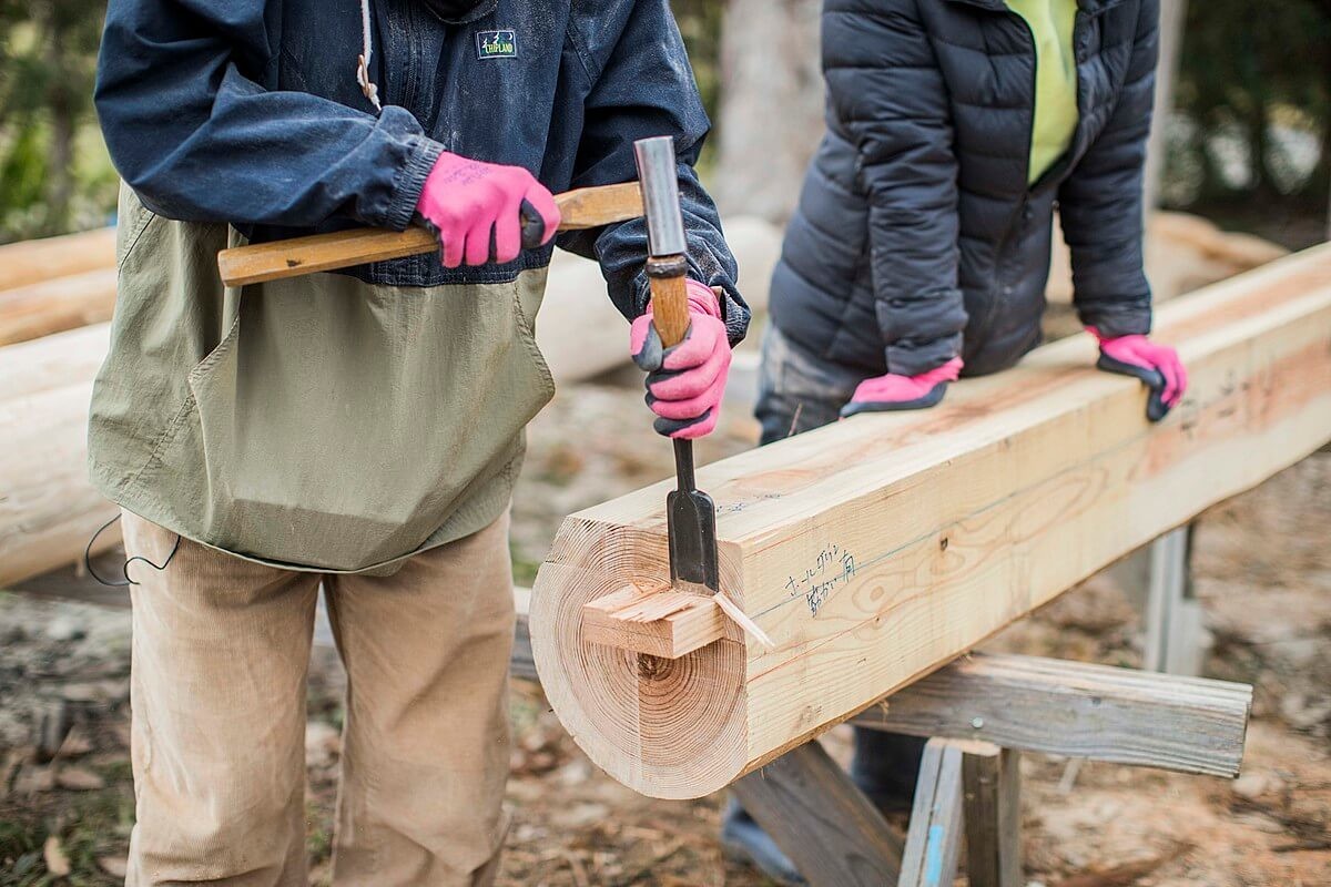 家の柱は、釘を使わず、複数の木材をつなぎ合わせてつくります。木材同士を組み合わせるために、柱に突起や穴を作り、家の主な骨組みができるよう木材を加工します。これを「ホゾ加工」といいます。