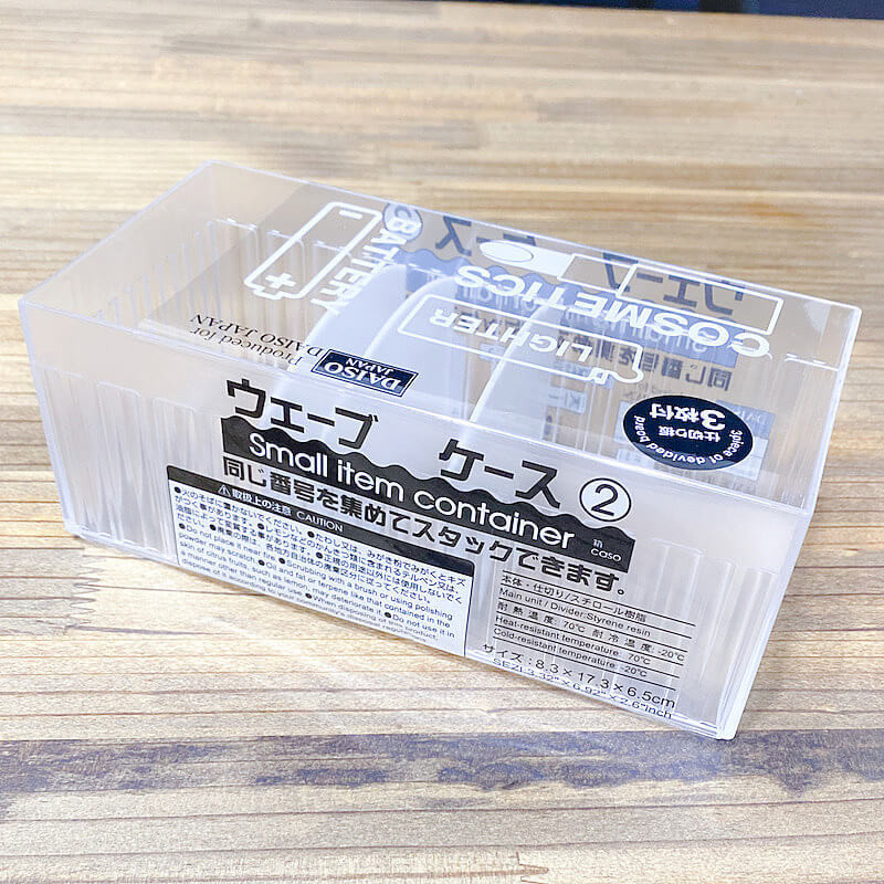 ウェーブケースは、本来の使い方ではなく縦に置いて使用します。仕切りを、パウダーが入るくらいの幅にしておいてください。