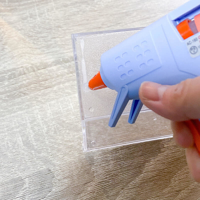 フタ付クリアケースは、3段引き出しケースの上に2つ並べて、グルーガンで接着していきます。