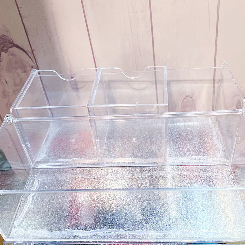 写真は、フタ付クリアケースと3段引き出しケースをグルーガンで接着後、キューブケース用トレーを入れた図です。