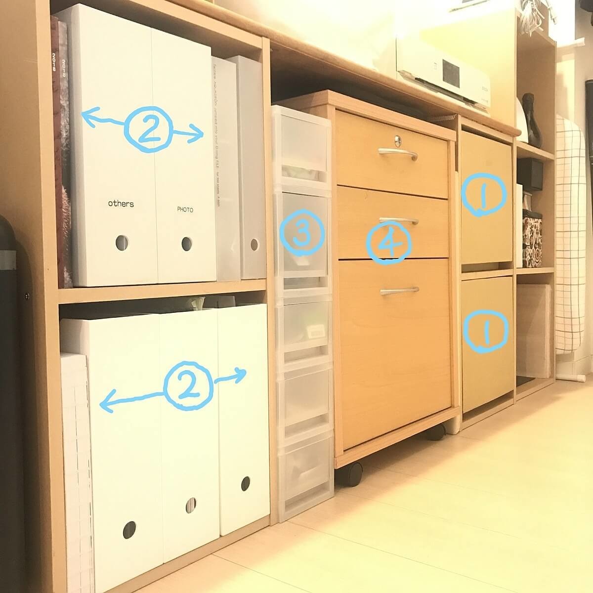 以前ここにあったデスク(今はリビングに移動)の引出し(④)と、それ以外は無印良品の収納グッズです。モジュールが揃っているのできれいに収まります。