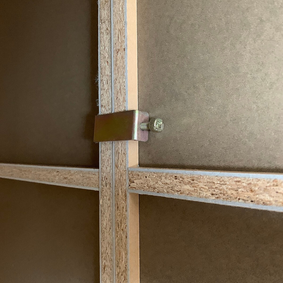 隣り合う2段のパルプボードボックスは後ろでジョイント金具で固定すると安定しますし、地震の時安心です。工具不要ネジを回すだけの簡単取り付け。