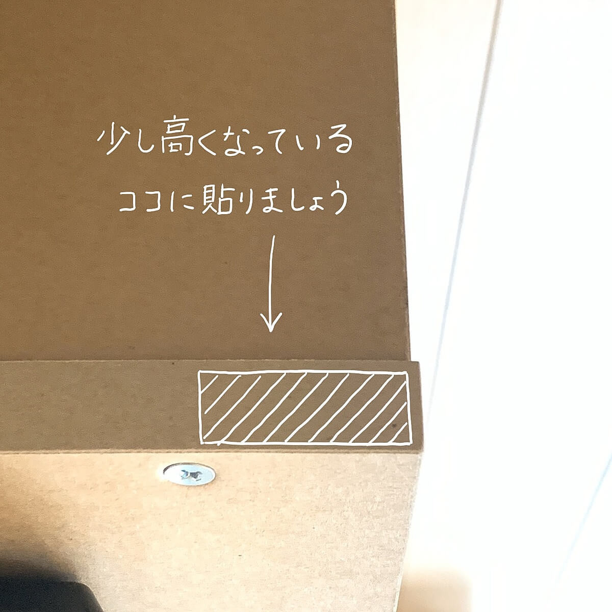 パルプボードボックスの上面は天面と両端に高さの差があります。両面テープは板としっかり接触する端っこに貼りましょう。