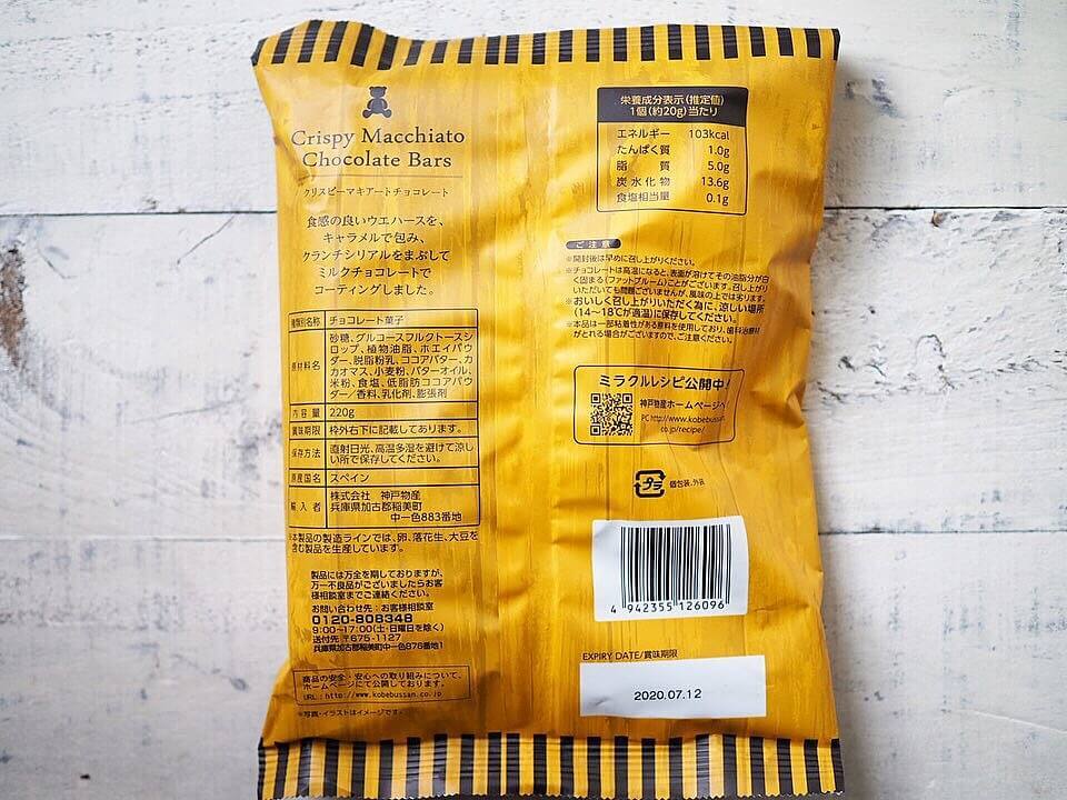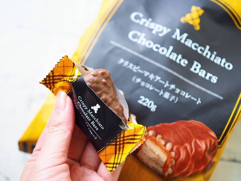 業務スーパーのテディベアマークがかわいいチョコバーシリーズの「クリスピーマキアートチョコレート」です。