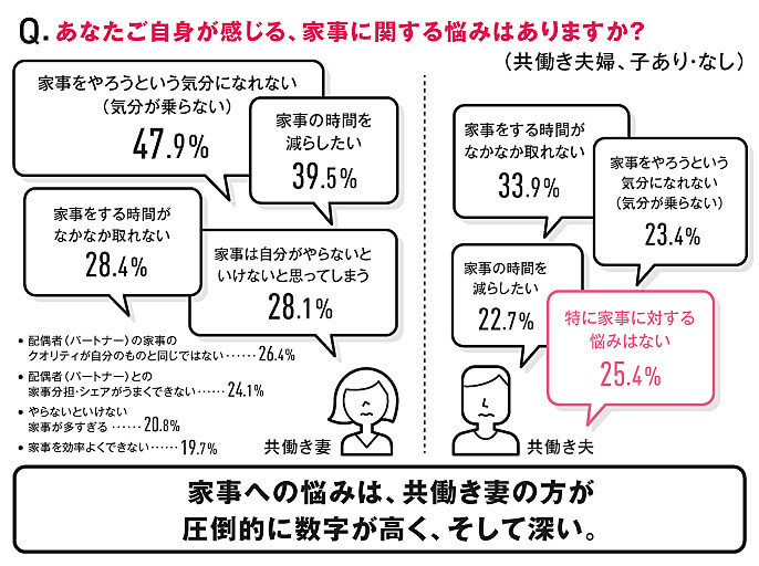 …一方で、共働きの夫側は、「特に家事に対する悩みはない」(25.4%)