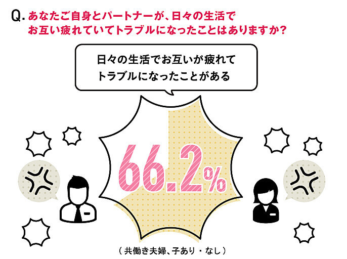 ところが、パナソニックの調査(※)では、共働き夫婦のうち「66.2%」が、家事にまつわるトラブルを経験。実は、「家事シェア」が増えている一方で、仕事に家事に子育てに忙しい共働き夫婦のあいだで、トラブルも生まれていることが分かりました。