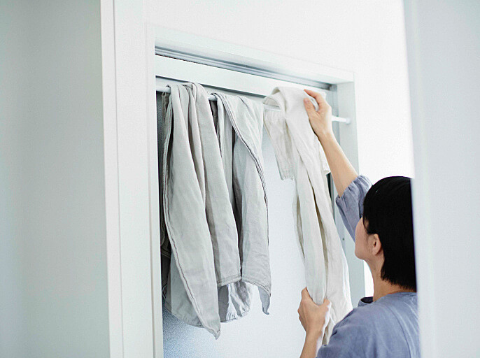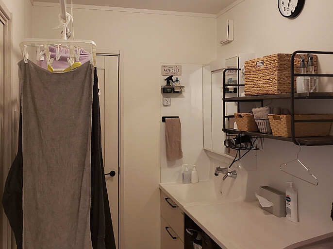 我が家では、浴室前につっぱり棒を設置して、取り込んだバスタオルをそのままかけて使います。「洗う」「干す」「しまう」を1箇所に集約させた動線づくりをしています。