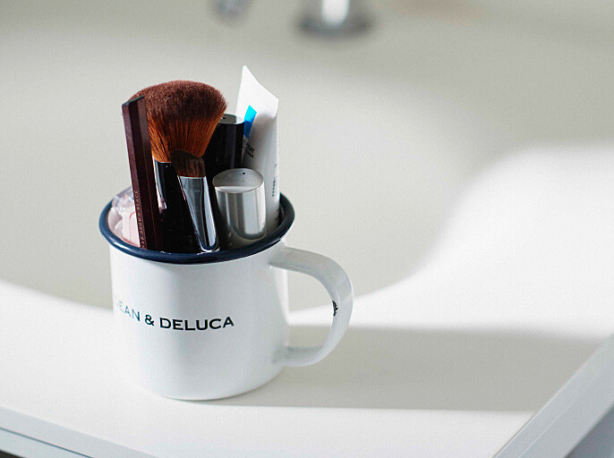 時間を上手に使うためには、迷う時間を作らないこと。私は毎日のメイク道具を1ジャンルにつき1個までと決めています。さらに、すべてをひとまとめにして取っ手つきのコップにイン。