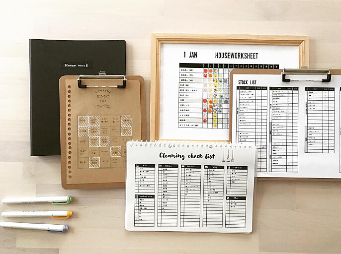 1カ月の家計簿、お掃除リスト、ストックリストなどを、手帳風のかわいいデザインで揃え、セットで使っています。モノトーンのデザインに、達成したらカラフルに記入していくと、愛着もひとしお。この「家事ノート」のおかげで、家事が楽しくなり、家事ストレスから夫婦喧嘩をすることも無くなりました。(@mukuri__365さん)