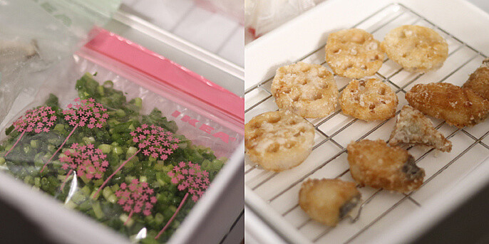 ネギやきのこなどの細かくした野菜を、パラパラに冷凍できて使いやすく、香りも落ちにくいのが最大の魅力。また、揚げ物を作ったらすぐに冷凍。解凍してもさくさく食感を保ったままなのはすごい!時短もおいしさもかないます。(@___yoko.rtyさん)