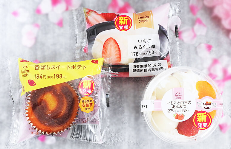 今回は、ファミリーマートの新作スイーツ「いちごみるく大福」「いちごと白玉のあんみつ」「香ばしスイートポテト」をご紹介します。