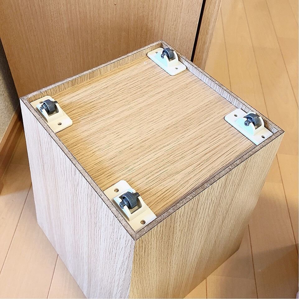 木製のごみ箱の底には、ダイソーの「らくらくピタッとキャスター」をつけています。