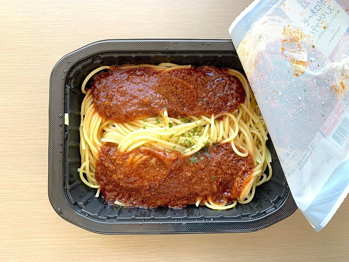フタをめくると、ボロネーゼソースが2つのエリアに分かれてかかっています。