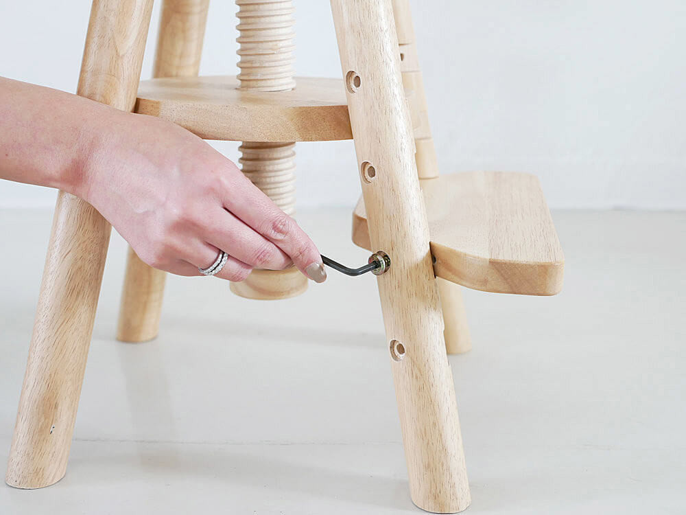 スツールにあるくぼみに足置きの板をはめて、付属のネジで固定してください。成長と共に必要がなくなった時は取り外しても使えます。