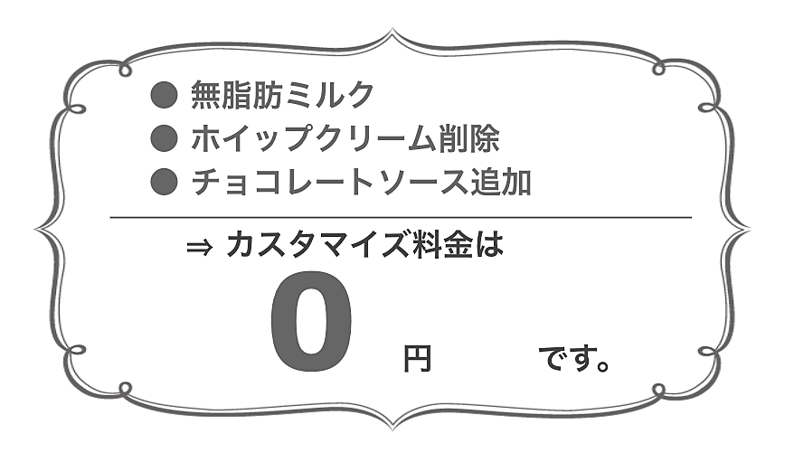 ホイップクリームは削除するだけで、83kcalもカロリーが下がります。また、無脂肪ミルクに変更すると、およそ30kcal程度のカロリーが下がりますよ!