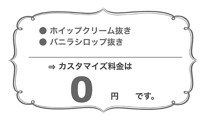 こちらは、バニラクリームフラペチーノ®︎に使用されているバニラシロップを削除し、ドリンクの上にトッピングされているホイップクリームも削除したカスタマイズドリンクです。