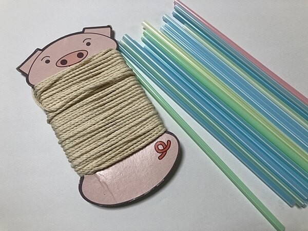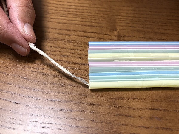 両端のストローに、たこ糸を通します。通しにくければ、たこ糸の先をセロハンテープで巻いてからやってみてください。